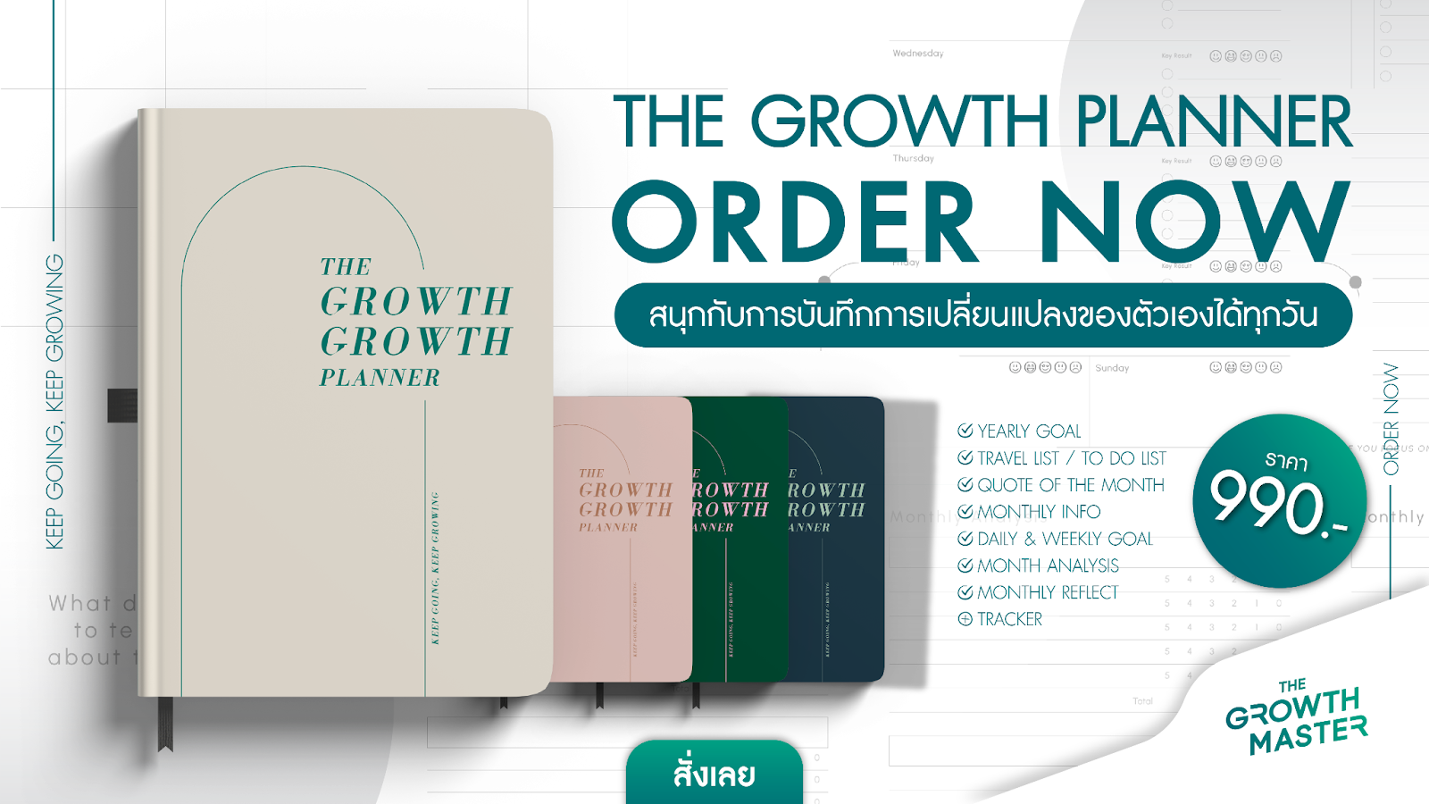 ลองให้การวางเป้าหมายของคุณทำได้สนุกและมีประสิทธิภาพกว่าเดิม ด้วย The Growth Planner ในราคา 990 บาท (พร้อมส่งและจัดส่งฟรีถึงบ้านคุณ) กดที่รูปด้านล่างเพื่อดูหน้าตาภายในเล่มและรายละเอียดวิธีการใช้งานทั้งหมดได้เลย